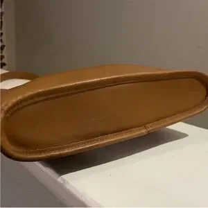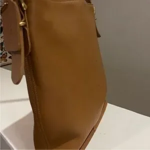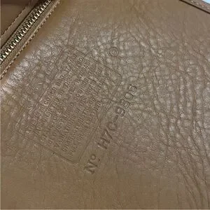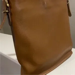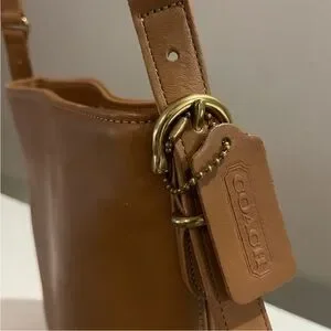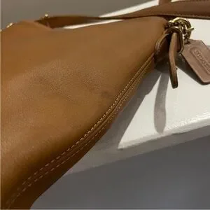 Authentic vintage leather shoulder bag by Coach, crafted from rich tan leather with a clean, timeless silhouette. Features an adjustable shoulder strap, zip-top closure, solid brass hardware, and spacious interior with slip pockets.