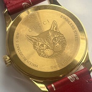 Stylish Gucci watch with a red strap and gold accents. Features an intricate butterfly motif. The watch in the image is the Gucci G-Timeless model YA1264054.