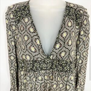 This elegant Free People V-neck top features a stylish pattern, perfect for any occasion. The long sleeves and intricate design add a touch of sophistication to your wardrobe. Women’s sized m. Smoke free home.