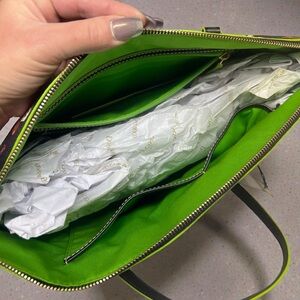 • Sturdy black leather double handles with neon green stitching and trim for contrast and durability