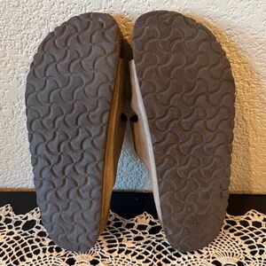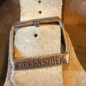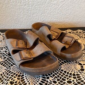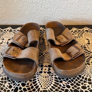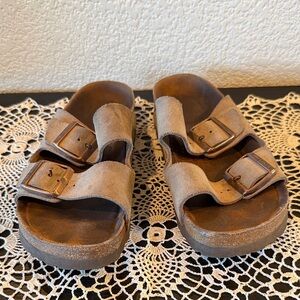 Birkenstock Taupe Arizona Sandals. Classic Birkenstock sandals. In taupe (tan/gray). Double signature logo embossed buckle strap uppers. Roomy foot box. Lightweight EVA and cork footbed. Pre loved condition. Look and feel good on. Pet and smoke free home.