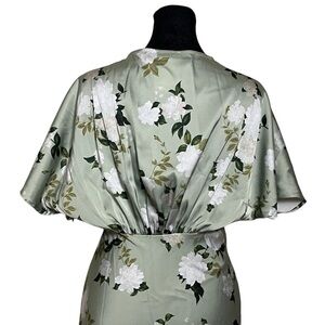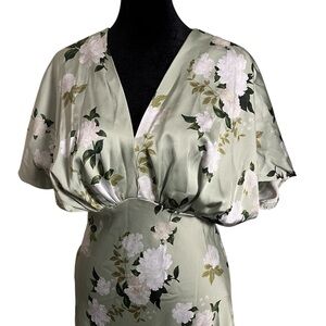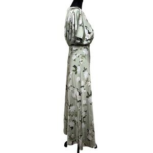Romantic and elegant BHLDN satin maxi dress in a soft sage green with a white floral print. Features a plunging V-neckline, draped flutter sleeves, ruched bust detail, and a flattering fitted waist. Hidden side zipper. Perfect for weddings, garden parties, spring events, bridesmaids, photoshoots and school dances.