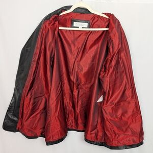 Elisabeth by Liz Claiborne black genuine leather blazer-style jacket with a classic notched lapel, button front closure, and structured silhouette. Fully lined in a deep red satin-like lining for a bold contrast interior. Soft leather with a broken-in feel and a longer blazer cut that works well for layering or everyday wear.