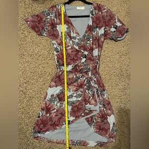 Elegant floral wrap dress with a deep V-neck. Features a beautiful blend of colors.