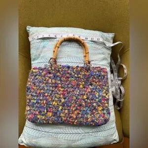 This vibrant multicolor woven satchel features unique bamboo handles, perfect for adding a pop of color to any outfit. Ideal for everyday use, this bag combines style and functionality.