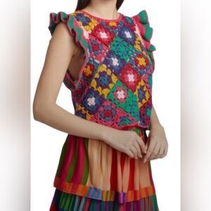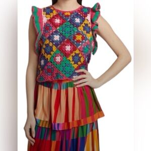 Farm Rio Crochet Square Vest Colorful Cotton Sleeveless Ruffle Size S NWT