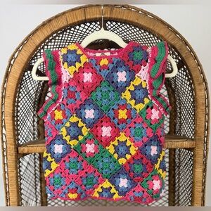 Colorful cotton crochet construction with an easy, relaxed fit. Features a classic crew neckline, sleeveless silhouette, and ruffled armhole detailing for a playful, statement look. Multicolor granny-square pattern throughout.