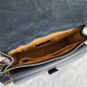 Elegant black leather bag. Features a decorative strap with metal accents. Ideal for daily wear.