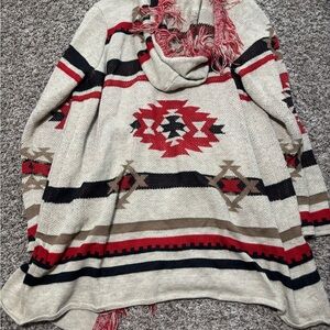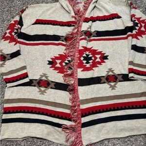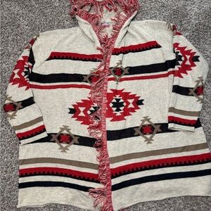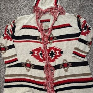 Cozy hooded cardigan with bold Aztec patterns. Features red and cream colors. Perfect for layering.