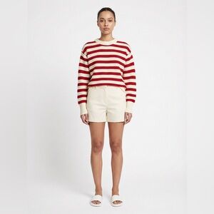 Elevate your wardrobe with this chic striped sweater in red and cream. Perfect for adding a pop of color to your casual outfits.