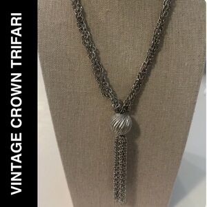 Vintage Crown Trifari Silver Tone Multi-Strand Tassel Necklace Textured Ball Slider