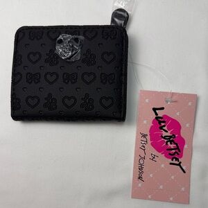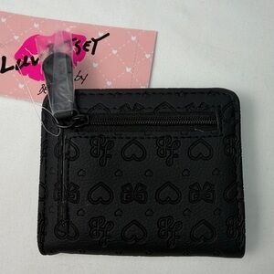 Betsey Johnson Snap Flap French Wallet in black with a heart and bow pattern.