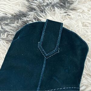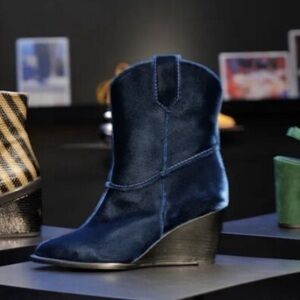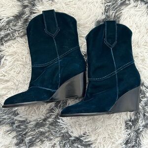 Stunning peacock blue boots in a soft velvet/velour. Cowboy style pull on bootie with a 3 inch wedge heel.