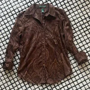 Elegant brown paisley blouse. Long sleeves. Button-up front. Classic collar.
