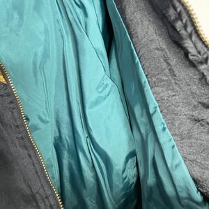 Pattern/Design: Bold geometric patchwork front and back with quilted teal panels and multicolor abstract floral tapestry sections on jacket; solid teal satin-finish track pants