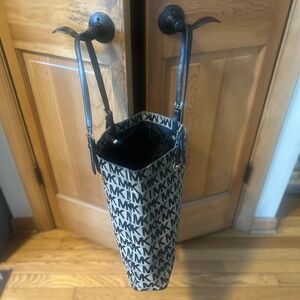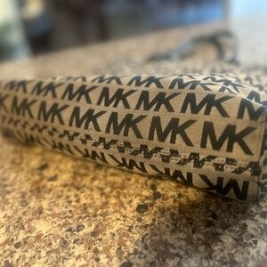 Pristine Michael Kors Brown Monogram Tote Handbag. Double brown leather adjustable straps and gold tone hardware heat-stamped with designer name. Snap closure opens to spotless beige monogram lining, leather nameplate, and inside pockets. Big and roomy. Measures 18" x 18" x 5".