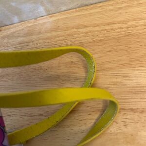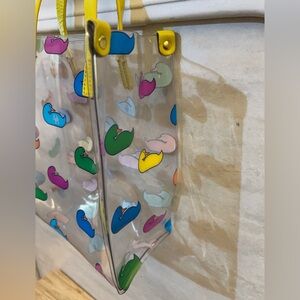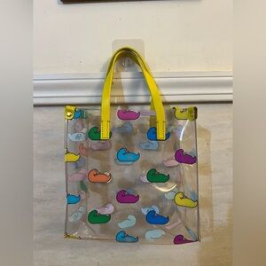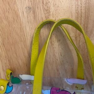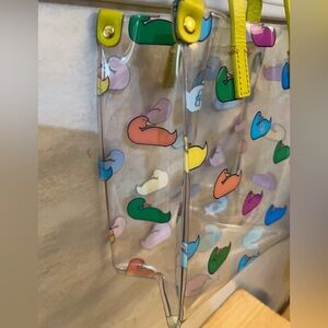 • It is a clear, flexible acrylic bag with a colorful all-over duck print and yellow leather top handles.