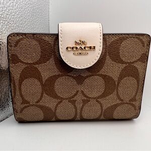 Chic Coach wallet with signature pattern. Features tan and cream tones. Ideal for daily use.