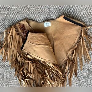 vintage suede shawl, suede fringe shawl, brown tan suede wrap, western suede shawl, fringe suede wrap, shawl collar wrap, western shawl collar, floral beaded suede shawl, beaded suede wrap, boho fringe shawl, festival shawl womens, westerncore fashion, cowgirl chic wrap, boho luxe layering piece, indie sleaze western, 70s western shawl, hippie western style, statement festival wrap, earthy tone suede shawl, vintage festival wear, womens vintage shawl, suede fringe topper, pre owned, excellent condition