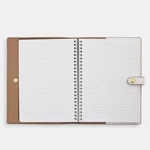 This limited edition Coach notebook is made of iconic signature canvas with smooth leather in a beautiful Chalk / White . A classic Coach style that features snap closure. Notebook measures approximately 6.75" × 8.5" and includes a 52 page spiral notebook.