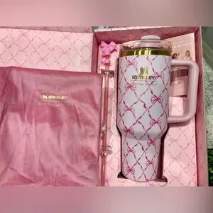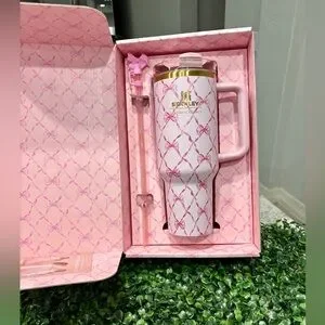 Charming pink tumbler 40 oz with bow pattern. Includes matching straw and box.