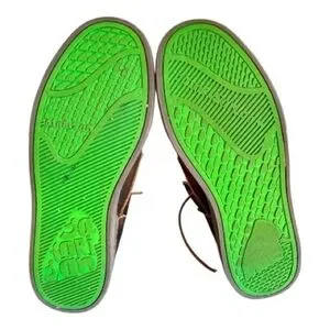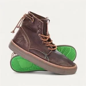 Trendy brown leather high-top sneakers with eye-catching green soles.
