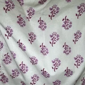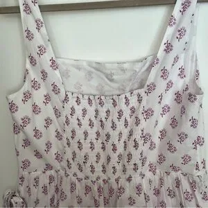 Elegant dress with a smocked bodice. White base with subtle purple accents. Sleeveless and stylish.