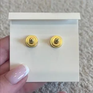 Chic stud earrings with gold logo on cream background. Ideal for versatile styling.