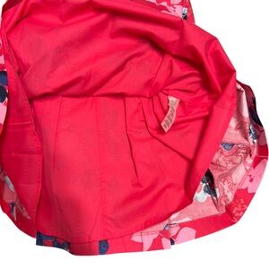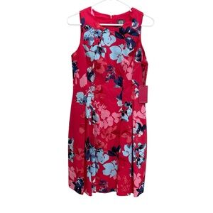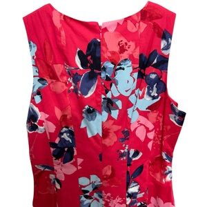 Beautiful bright pink and shades of blue floral print .Hidden back zip closure . Sleeveless and fully lined . A pleats below waistline give it a flare .
