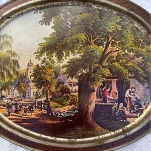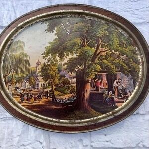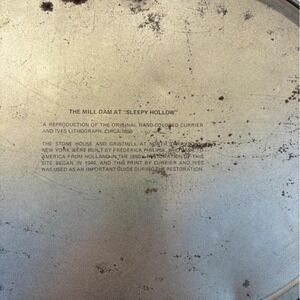 Two pre-owned vintage tin trays, each depicting a different pastoral scene. Trays are approximately 14 inches in diameter. The metal shows signs of age, including discoloration and minor surface wear. One tray features a mill and river; the other shows a village street scene. Both feature vibrant, though faded, colors. The images appear to be lithographs. The trays are lightweight and show some minor scratches and scuffs consistent with age and prior use. Perfect for the literature lover in your life. The Mill Dam at Sleepy Hollow and The Village Blacksmith.