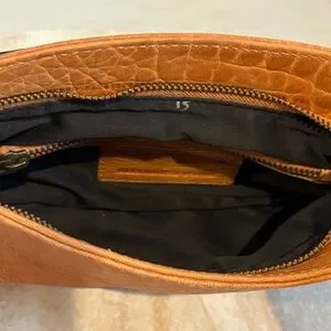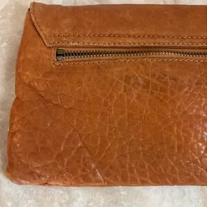 A brown colored leather envelope clutch bag with aged gold brass studs on front of bag with same color hardware all over the bag, preloved and used, in good condition, does have some corner wear and the back zipper is off the track but could easily get repaired and leather conditioned and would look like new! The dimensions of this clutch bag are: