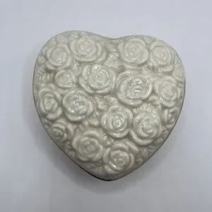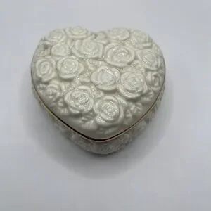 ROSES BOUQUET ON A HEART SHAPED TRINKET JEWELRY BOX.