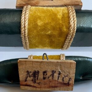 Mounted on wood, green leather wrapped with brass tacks, and braided hemp rope. Made in Mexico. Age unknown, but the materials, technique, and patina suggest vintage.