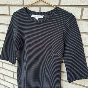 Lesley Evers “Miranda” ribbed knit dress in black and gray. Crafted from 100% wool with fabric imported from Austria. Features a classic sheath silhouette with pullover styling, crew neckline, and three-quarter length sleeves. Refined ribbed texture throughout gives structure while remaining comfortable and polished. Size Small. Excellent used condition.