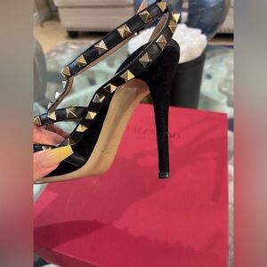 this is an authentic Valentino Garavani rockstud heels in black suede and leather. This item is used my own personal shoes. I probably used it twice. I put the patch on the bottom just to protect it. The patch is removable. I am usually a size 38 1/2 and these are 39 so they fit me well for reference, comes with dust bag and box.