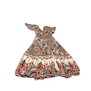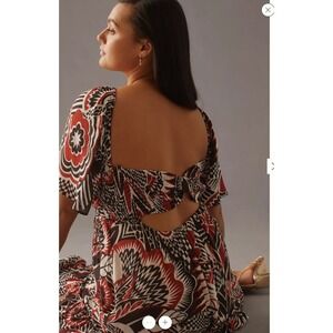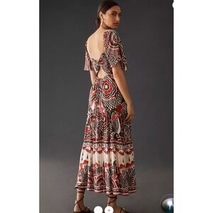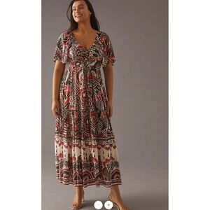 The Anthropologie Tiered Maxi Dress in plus size 3X features an open back and boho style, making it perfect for various occasions such as travel, weddings, parties, or casual outings. The dress has a floral pattern in a vibrant red color, with a V-neckline and flutter sleeves for a stylish and comfortable fit. Made of viscose fabric and designed with layered accents, this long dress is machine washable and is ideal for all seasons, adding a touch of bohemian flair to your wardrobe.