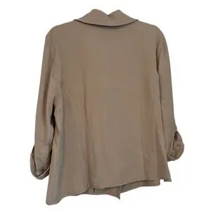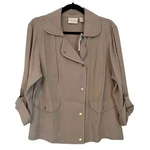 Stylish utility jacket with button closure. Features practical pockets and rolled sleeves. Ideal for versatile wear.