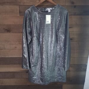 Turn heads in this stunning metallic silver shimmer dress from H&M! Perfect for holiday parties, New Year's Eve, girls' night out, or anytime you want to sparkle. Features a flattering straight cut, crew neckline, long sleeves, and a hidden zipper back. Fully lined for comfort.