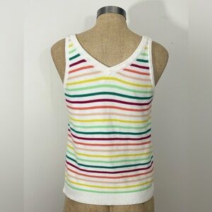 The product is a stylish and versatile LOFT Ann Taylor Women's Striped Button Front Sweater Tank Top in size M. This sleeveless tank top features a striped pattern, a V-neckline, and is made of 100% cotton material. The multicolor design adds a trendy touch to this basic yet chic top, making it a great addition to any woman's wardrobe. Perfect for layering or wearing on its own, this tank top is a must-have for a fashionable and comfortable look.