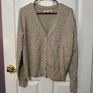 Loft size medium. Long sleeve beige cardigan covered with gold star sequins. 55%cotton 22%polyester 19%acrylic 4%spandex.