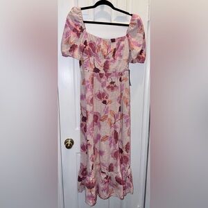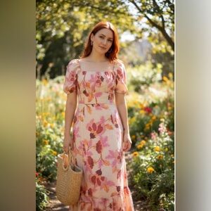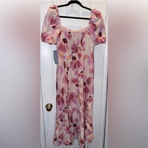 Chic pink floral dress with puff sleeves. Ideal for any event. Size 4