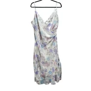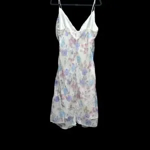 Pretty spaghetti strap floral midi dress with a cream base. Features purple and blue and pink flowers. The bottom has a cute asymmetrical ruffle. Perfect for any occasion. The dress is in good pre-owned condition. The straps do not adjust. Very whimsycore, fairycore style. This would be lovely for school, lunch dates, date night. Add a sweater or blazer and it's good for cooler weather. Angelcore, whimsygoth, fairycore, fairygoth, sexy, vintage, Indiesleaze, boho, party, spring, summer, vacation, cruise, resort, babydoll