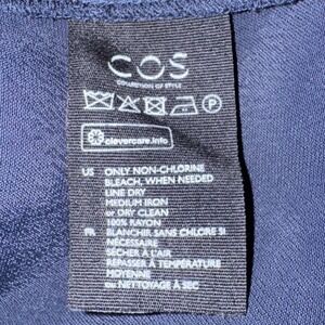 Keywords: COS dress, navy dress, silk blend dress, minimalist dress, workwear, evening dress, sophisticated, chic, modern, short sleeve dress, sheath dress, professional attire, business casual