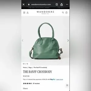 Wanderers Travel Co. “THE BANFF CROSSBODY”. Soft full grain cow leather in green. Dimensions: H 23cm x W 28cm x D 12.5cm (9.1" x 11" x 4.9"). Zippered closure. Internal zippered pocket. 2 x internal open pockets. Double handles with a 17cm (6.7") drop. Removable, adjustable shoulder strap - 75cm (29.5") to 134cm (52.8"). Metal hardware. GORGEOUS HANDBAG! Excellent preloved condition! Smoke free and clean home! Retails today for $169. Offers welcome!