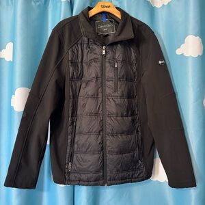 Men’s Calvin Klein mixed‑media softshell jacket in black, size Medium.