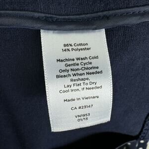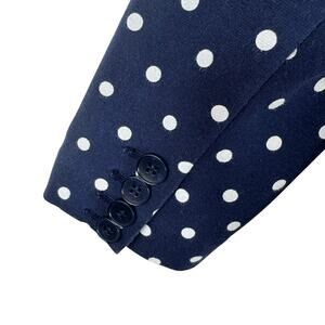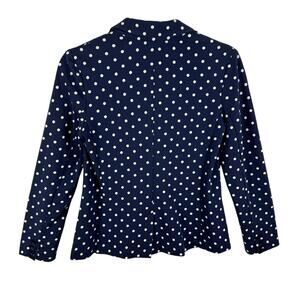 Excellent preowned condition. Navy blue with white polka dots collared single breasted button front lightweight knit blazer. Open pockets on lower front sides. 3 buttons on each sleeve. Has some stretch. Cotton/polyester material. Approx. measurements: Shoulder to hem 23", pit to pit 18", sleeve from neck to sleeve hem 25". Size S Petite.