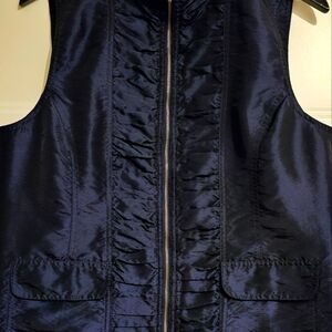 Beautiful Deep Blue Iridescent Vest with a Pleated Body, Gold Tone Zipper, Waist Length Fit, and Lined Flapped Pockets. Lightweight and in Excellent Condition.