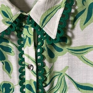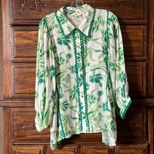 Entro White and Green Floral Wide Sleeve Button Down Shirt