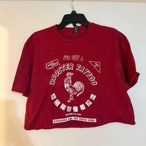 Vintage-style cropped graphic tee featuring Giovannie & The Hired Guns “I’ve Got a Rooster Tattoo” design 🐓