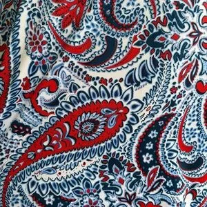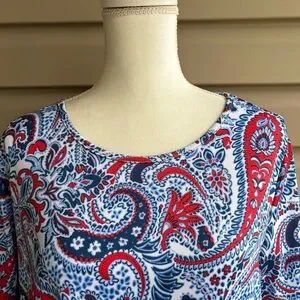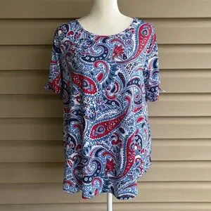This is a colorful and comfortable pullover top from Ruby Rd., ladies size Medium. The knit fabric, 91% polyester/9% spandex, is an allover paisley print in red, navy, light blue, and white. This easy-to-wear blouse has a classic round neckline, curved hemline, and short sleeves with tied cuff detail for a polished casual look. The soft, stretchy fabric offers a flattering drape and all-day comfort. This versatile item is perfect for work, casual outings, or layering under a cardigan or jacket!